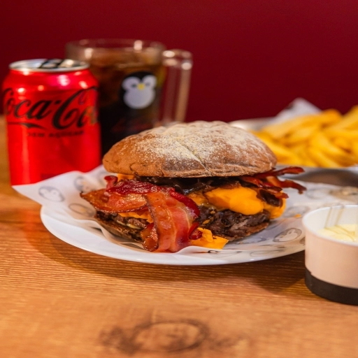 Pão da Casa, Molho de Queijo, Dois Hambúrgueres de 100g cada, Queijo Prato, Ketchup Le Pinguê e Bacon. (Acompanha Fri... Ver completo