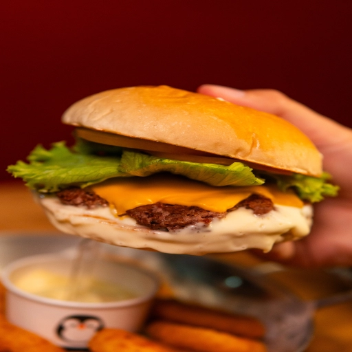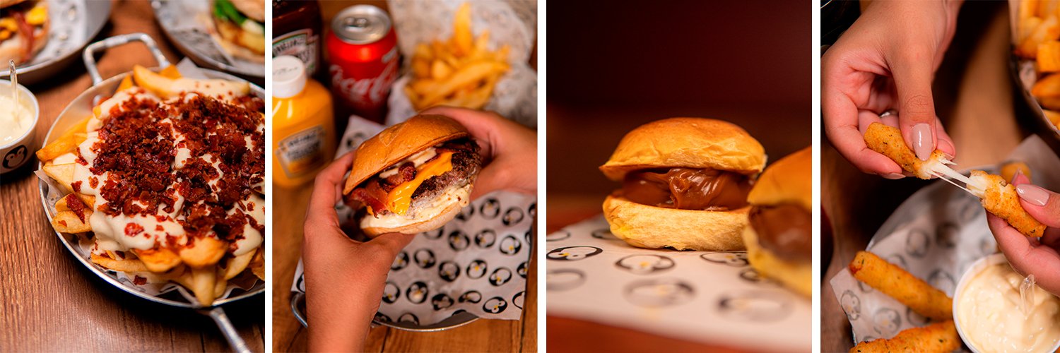 Pão da Casa, Molho de Queijo, Dois Hambúrgueres de 100g cada, Queijo Prato, Ketchup Le Pinguê e Bacon.