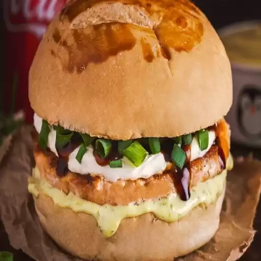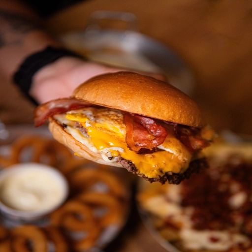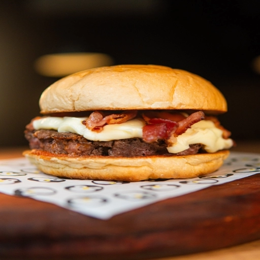 Pão Australiano, Maionese da Casa, Hambúrguer, Cheddar, Cebola Caramelizada e Bacon.