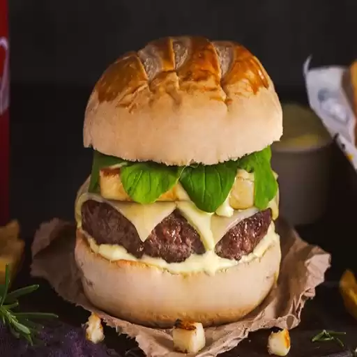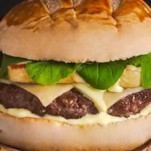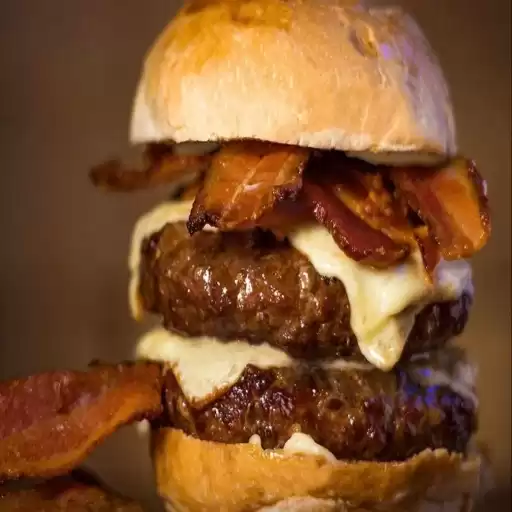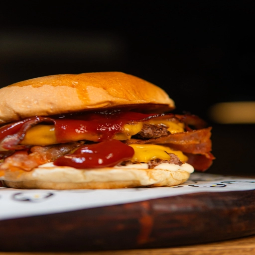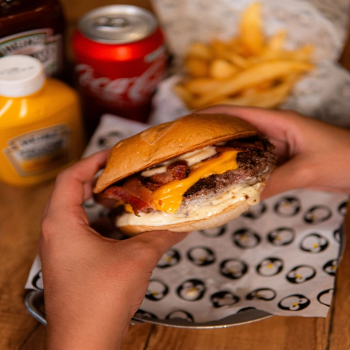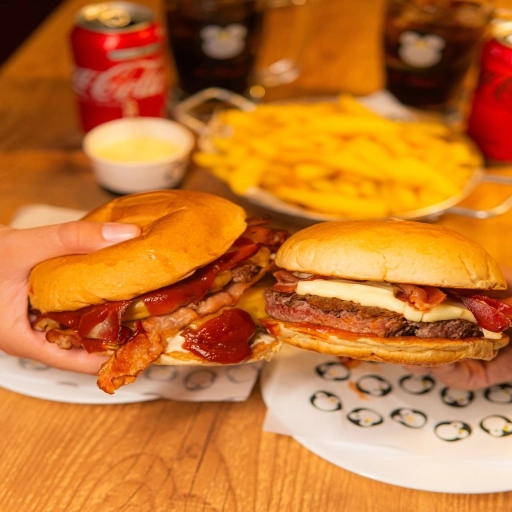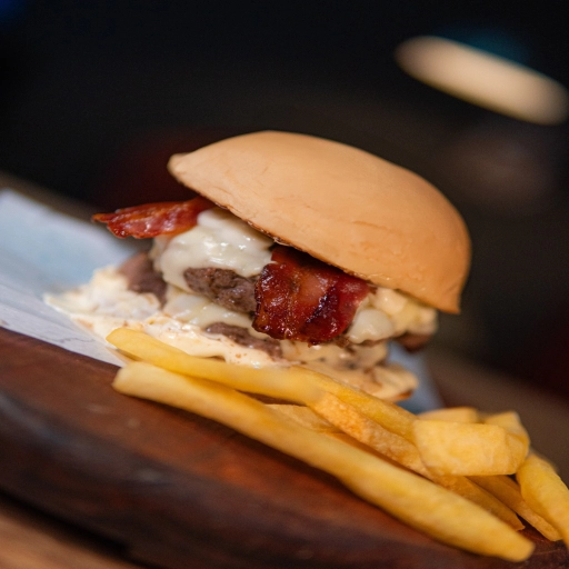 Pão e Maionese da Casa, 2 Hambúrgueres de 180g, Queijo Muçarela e Bacon.