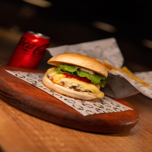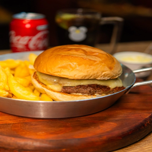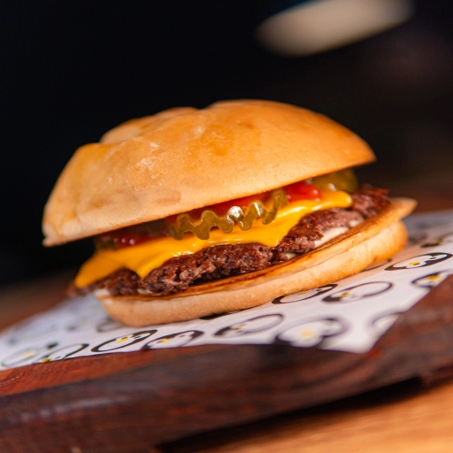 Pão e Maionese da Casa, Hambúrguer de 100g, Queijo Cheddar, Picles e Catchup.