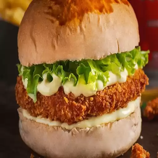 Pão e Maionese da Casa, Hambúrguer de Frango Empanado e Alface.