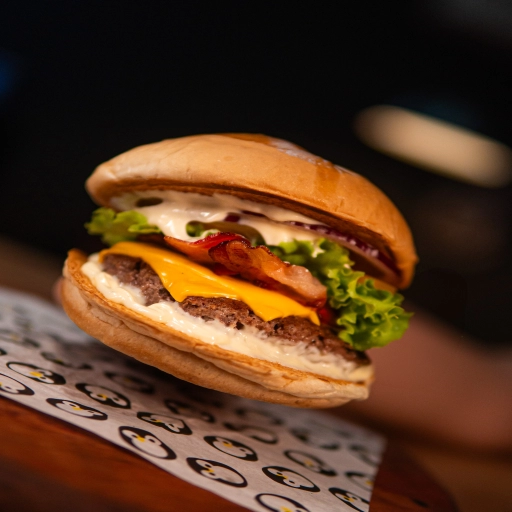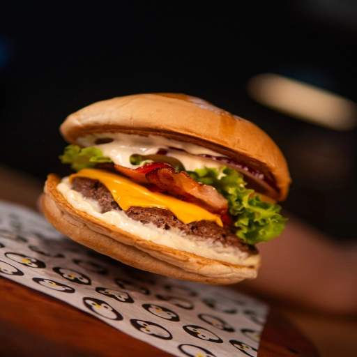 Pão da Casa, Maionese de Bacon, Hambúrguer, Queijo Muçarela, Cebola Roxa, Alface e Tomate.
