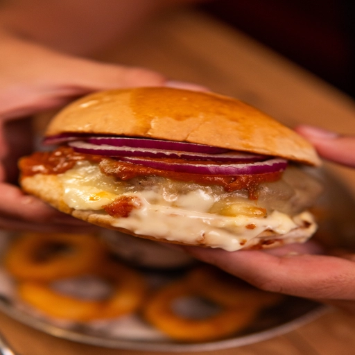 Pão e Maionese da Casa, Bacon Crocante, Hambúrguer de Costela, Queijo Provolone, Molho Barbecue e Cebola Roxa.