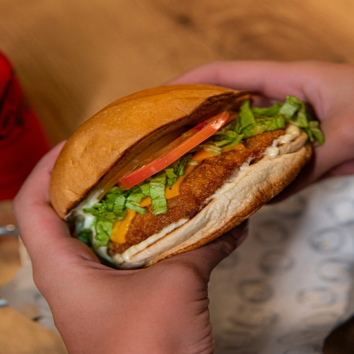 Pão e Maionese da Casa, Hambúrguer de Frango empanado, Queijo Cheddar, Alface e Tomate