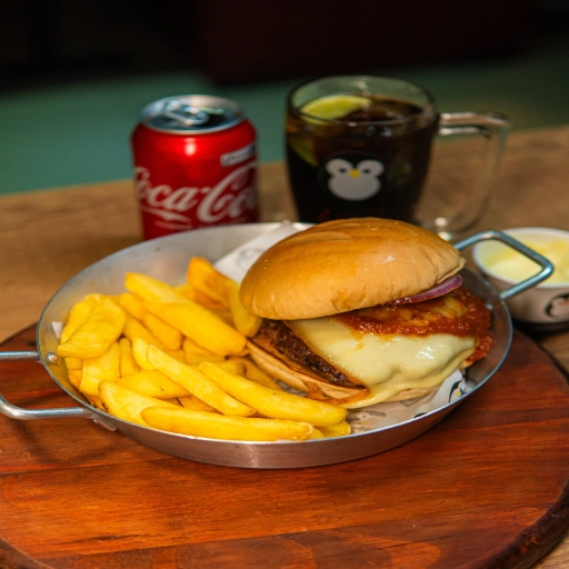 Pão da Casa, Molho de Tomate Le Pinguê, Hambúrguer, Catupiry e Bacon. (Acompanha Fritas, Bebida e Maionese da Casa)