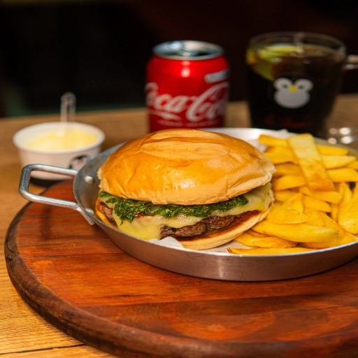 Pão da Casa, Molho de Tomate Le Pinguê, Hambúrguer, Queijo Muçarela e Chimichurri.